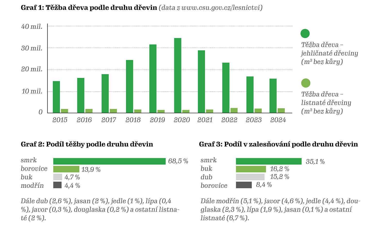 Dle dat z Českého statistického úřadu v roce 2024 klesla oproti předchozímu roku těžba dřeva o 0,7 mil. m3 (-3,7 %) na hodnotu 17,8 mil. m3. Z nahodilé těžby o objemu 8,0 mil. m3 pocházela již menší část vytěženého dřeva (45 %). Meziročně došlo u nahodilé těžby ke snížení o 3,0 mil. m3. Kalamita v lesích v Česku byla tedy na ústupu.